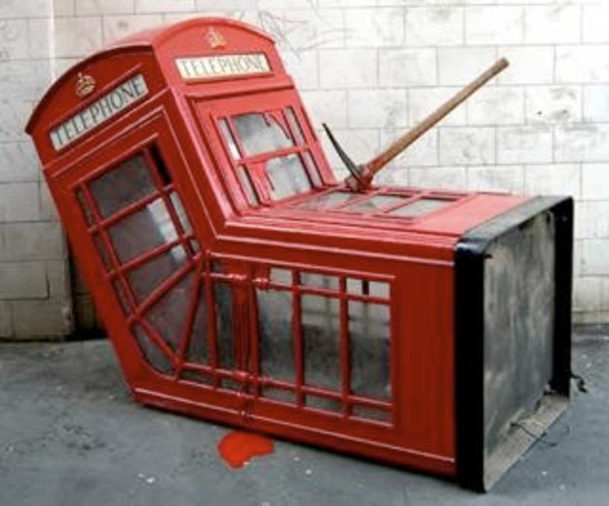 In April 2006, Banksy created a sculpture based on a crumpled red phone box with a pickaxe in its side, apparently bleeding, and placed it in a side street in Soho, London. It was later removed by Westminster Council.